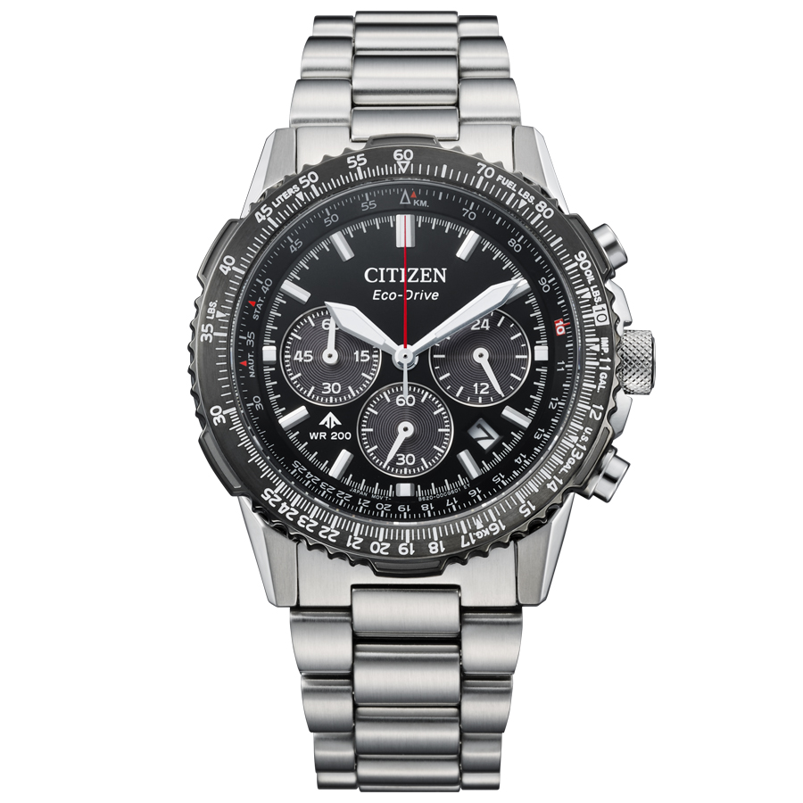 Caixa de aço, 13,8 mm de espessura, com fundo fechado a rosca e coroa a pressão. Bracelete em aço inoxidável com fecho de botão duplo. Aro giratório bidirecional com régua de cálculo. Vidro de safira plano com tratamento antirreflexo. Luminoso nos ponteiros e índices. Mostrador metálico. Magnetic Resistant. WR 20 bar.