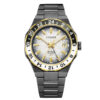 Caixa de aço Grey, 13,6mm. de espessura. Fundo da caixa transparente e aparafusado que permite ver o movimento. Bracelete integrado em aço cinzento com fecho de segurança duplo. Bisel bidirecional em aço dourado com “click feeling” e anel de registo black+white Mostrador gradation black. Vidro safira com tratamento antirreflexo. Ponteiros e index com tratamento “luminous”. WR 10 bar.
